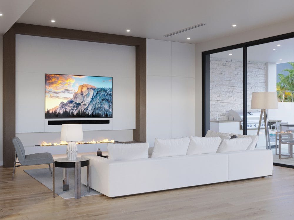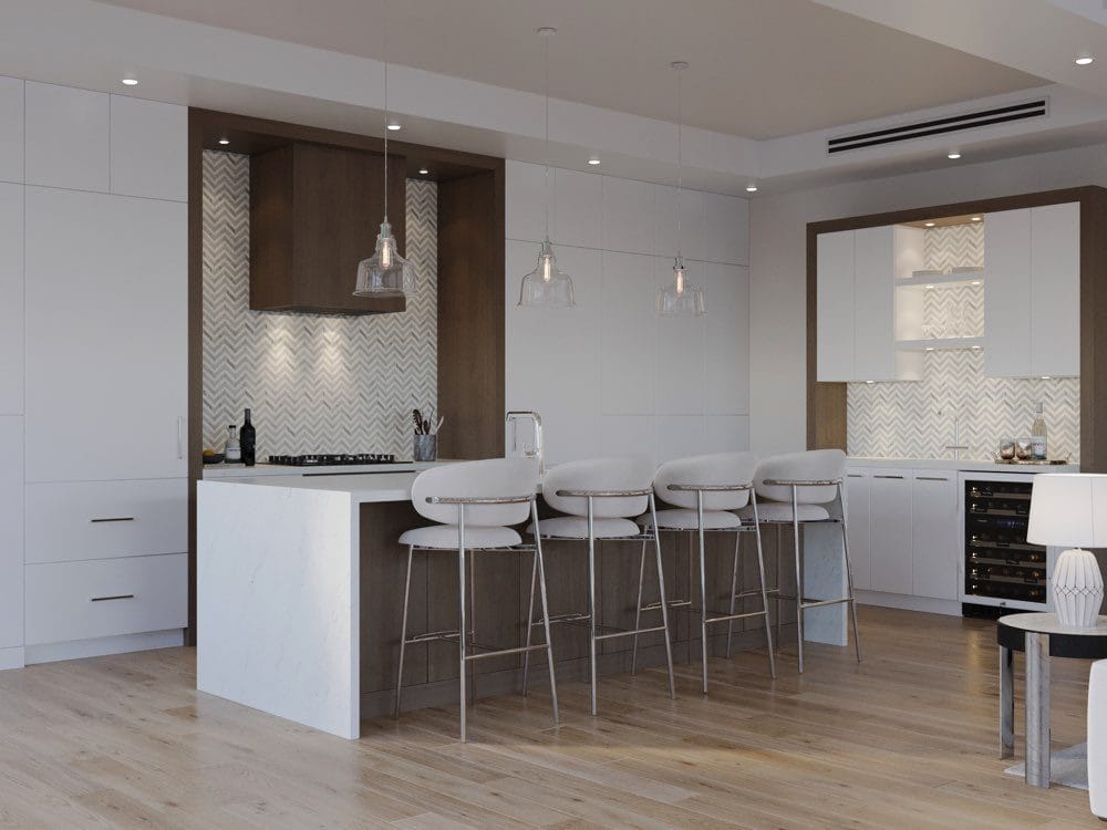 Comprehensive consultation, develop renovation plan, custom cabinetry, large kitchen island, herringbone backsplash installation, luxury bathroom remodel, double vanity and rain showerhead installation, premium hardwood flooring, fireplace installation, expansive windows, bespoke living room and dining area design, minimalist bedroom upgrades, tropical landscaping, outdoor living space enhancement, energy-efficient upgrades, project management, client handover.