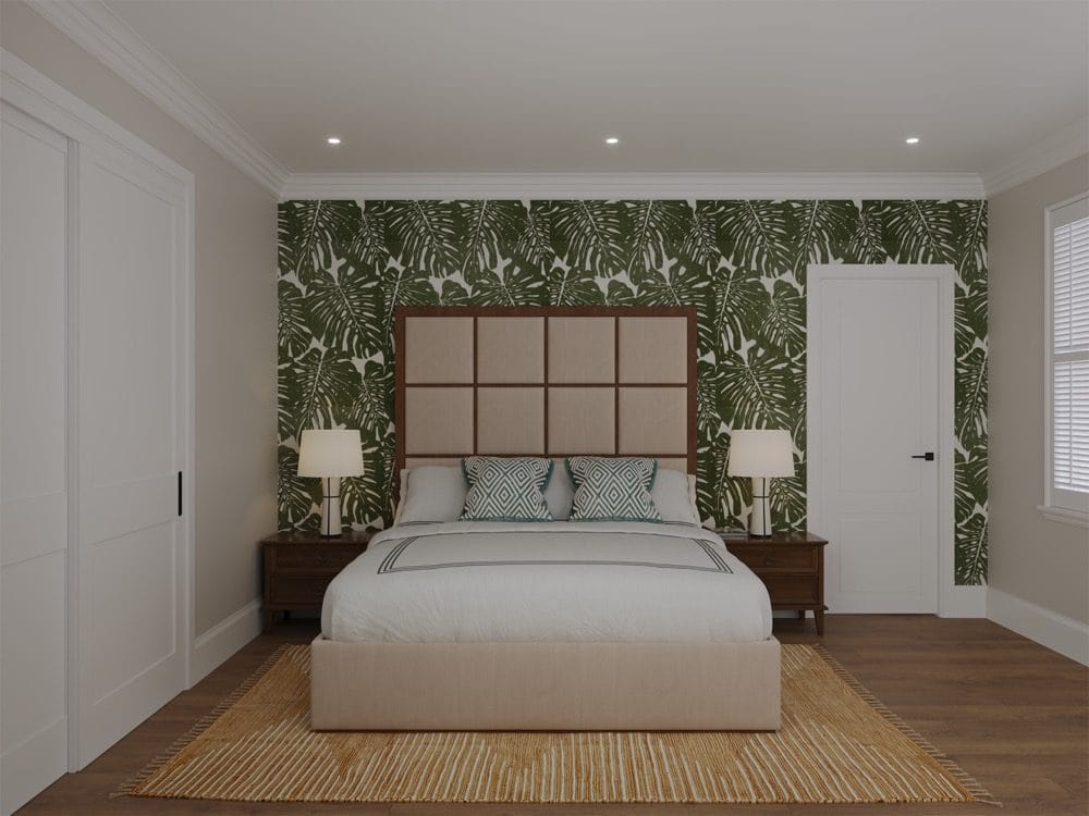 The bedrooms received equally thoughtful attention. We installed a statement wallpaper with tropical leaf patterns behind a custom upholstered headboard, blending the natural surroundings of South Florida into the interior design. Matching double nightstands, recessed lighting, and neutral tones contributed to a serene and restful environment.