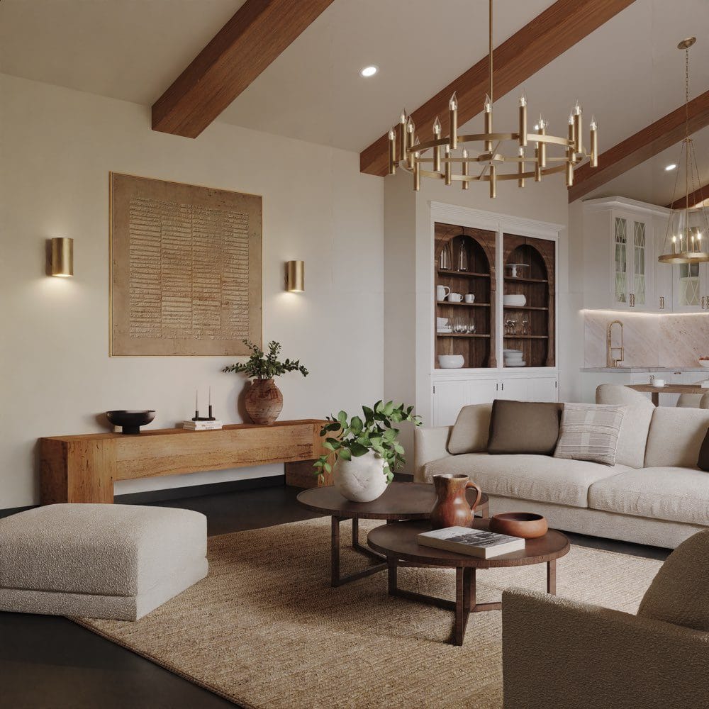 In the living room, we focused on creating a comfortable yet stylish space. The vaulted ceiling, adorned with wooden beams, added architectural interest and character. We introduced recessed lighting for a contemporary touch and a tiered gold chandelier to tie the space together. The focal point of the room was a custom-built entertainment wall featuring natural wood shelving and a marble-clad TV surround. Plush, cream-colored sofas with accent pillows and a textured area rug completed the cozy and upscale look.