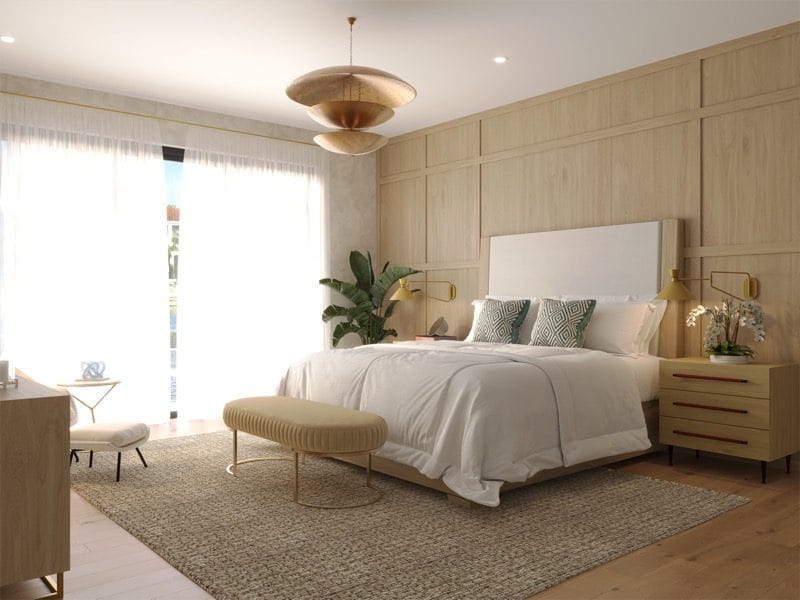 Moving into the bedroom redesign, we installed wide plank wood floors throughout and added a textured feature wall behind the bed using light natural wood paneling. The soft white linens on the bed, paired with designer bedroom lighting and golden wall sconces, created a space that was both refined and restful. Custom nightstands and mid-century inspired furnishings completed the space, ensuring comfort and style in every detail.