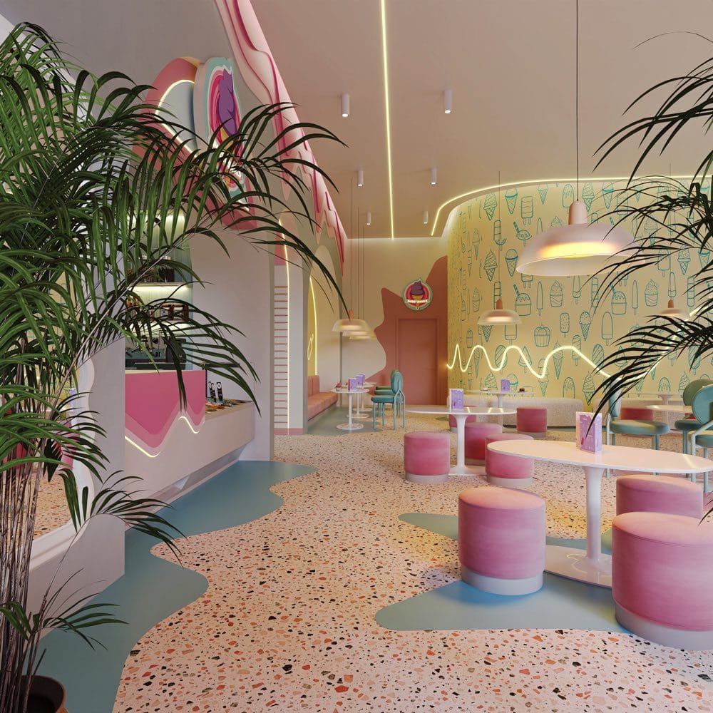 To bring this vision to life, our team executed a comprehensive commercial remodeling plan that included a complete interior redesign, installation of custom lighting, terrazzo flooring, and stylish furniture. One of the key highlights of this renovation was the use of pastel colors, particularly a pink and teal theme, creating a warm and playful ambiance that aligns with the shop’s brand identity. The walls were adorned with accent designs featuring ice cream-themed decor, while custom-built furniture such as curved seating, booth installations, and arched windows were integrated to enhance the aesthetics and comfort of the space.