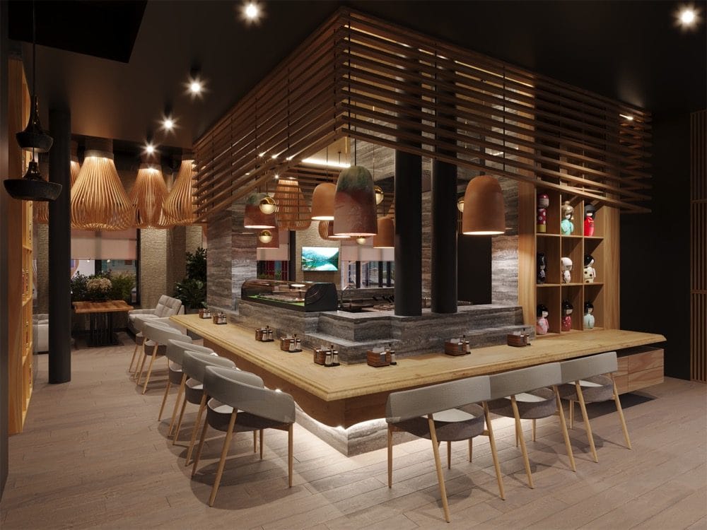 Throughout the project, we incorporated design elements that reflect modern dining design fused with traditional Japanese influence. Our use of natural wood tables, concrete and wood blends, and feature lighting brought warmth and depth to the interior. As seen in the images, we installed elegant pendant lighting and custom bar installations to create atmospheric architectural lighting. The sushi counter buildout was crafted with polished woodwork, granite tops, and underlighting to enhance the guest experience.