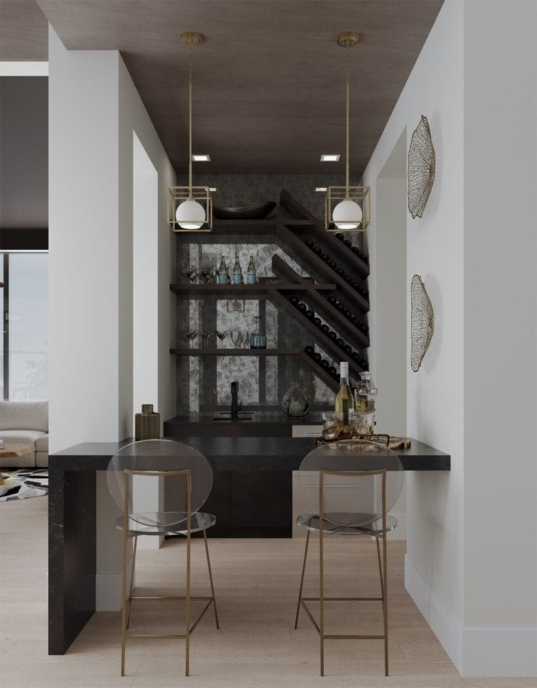 The modern kitchen renovation became the centerpiece of the home. We installed custom kitchen design elements including high end finishes, custom cabinetry, quartz countertops, and a large kitchen island installation with waterfall edges. High end appliance installation, integrated refrigeration, and smart home technology transformed the kitchen into a true luxury interior design build. Tile and stone work, under cabinet lighting, and floating shelving completed the upscale aesthetic.