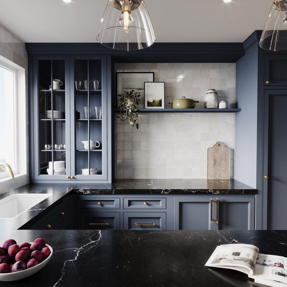 The Slate Blue Kitchen Remodeling Project in Manalapan was a transformative experience, starting with a comprehensive consultation between the RENOVA team and the homeowners. The goal was clear: to create a high-end kitchen that embraced modern elegance, functionality, and a personalized touch. Our skilled team planned each step with precision, focusing on a sleek kitchen design featuring slate blue custom cabinetry and luxurious black countertops. With construction management expertise, the five-week kitchen remodel began.