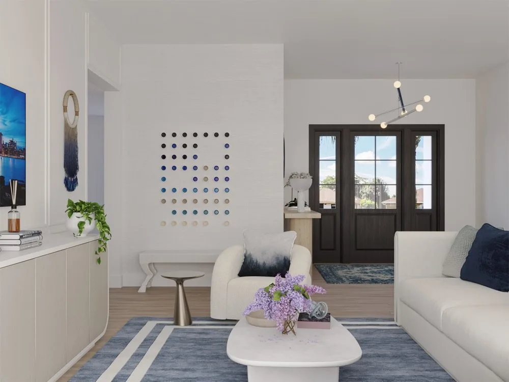 Moving into the dining room design, we introduced a custom-built dining table flanked by modern chairs featuring minimalist patterns that echoed the home’s blue accent decor. The living room renovation involved a new custom built-in entertainment center, a plush sectional sofa, and complementary modern wall art, producing a welcoming yet luxury living room environment. Soft, flowing sheer curtains maximized natural light and highlighted the room’s open dining space.
