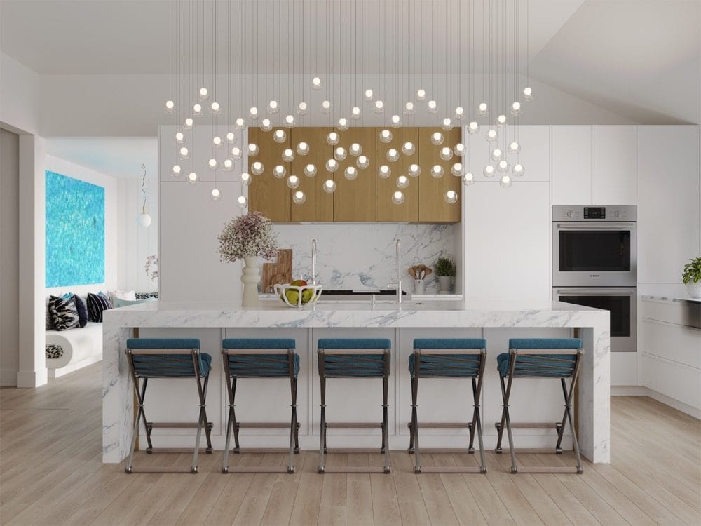 We started with demolition and new light wood flooring installation throughout, creating an airy living space. For the kitchen renovation, we incorporated a striking marble kitchen island and matching marble countertops, paired with custom cabinetry and a sleek modern backsplash to amplify the contemporary design. Above the island, we installed an elegant array of glass globe pendants to deliver dazzling statement lighting, enhancing the kitchen’s grandeur.